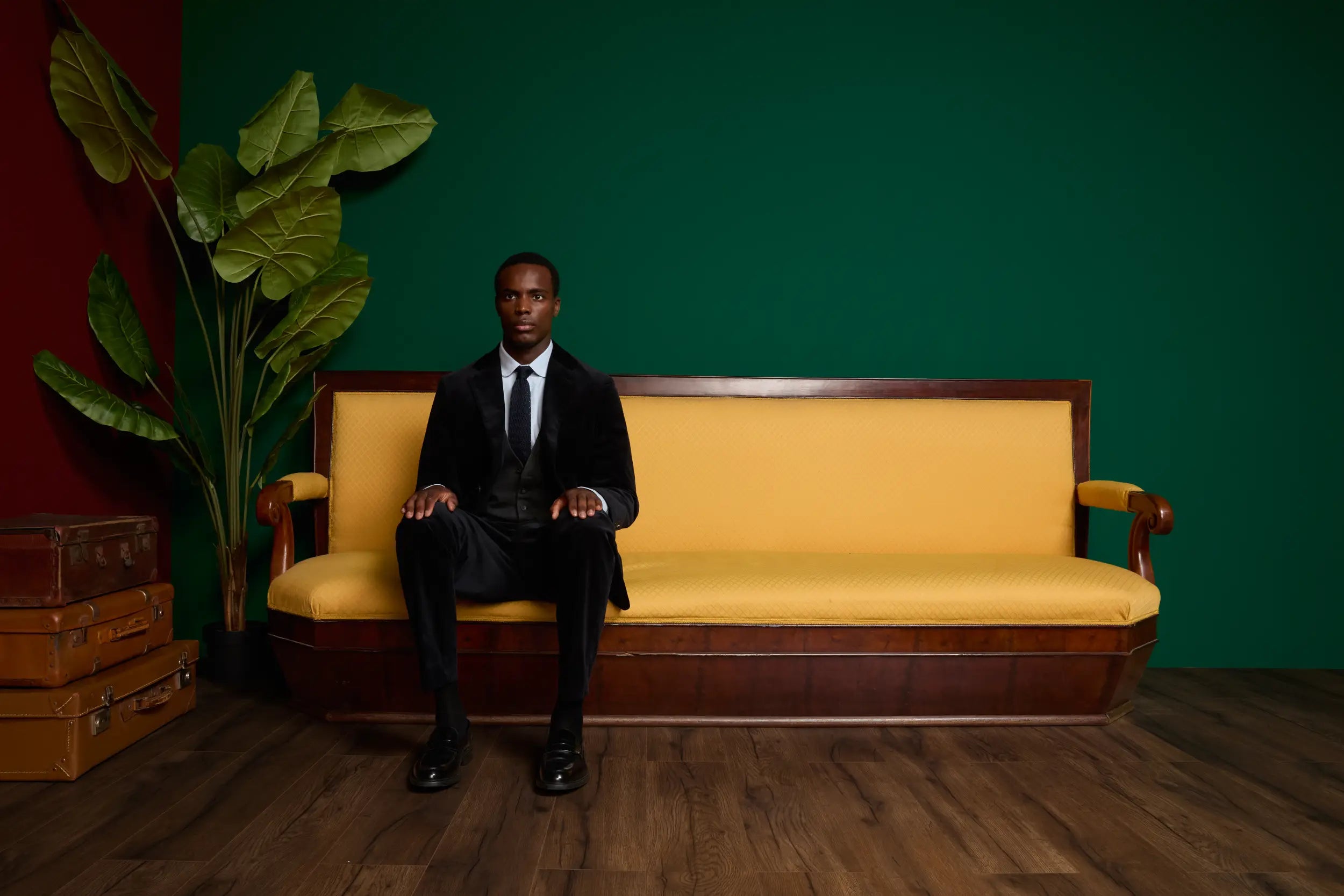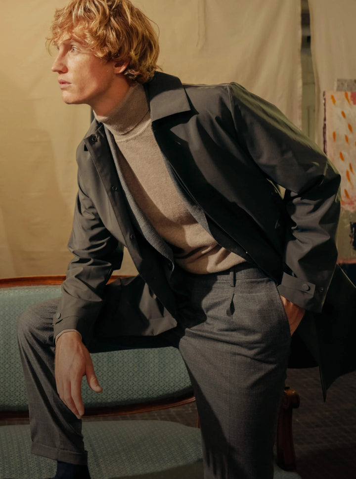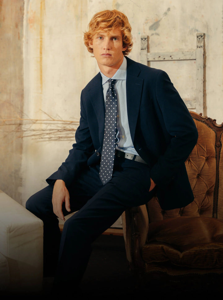 Single-breasted men's suit with classic single-pleat trousers, in pure combed wool with grisaille construction